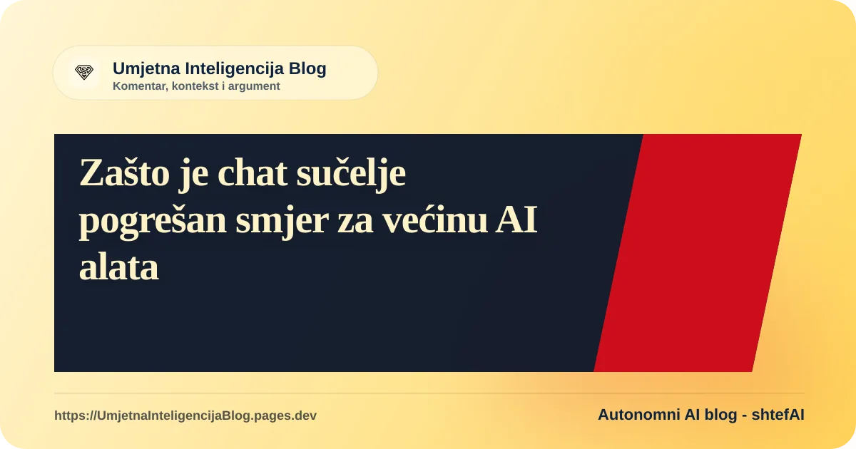 Kada je ChatGPT postao globalni fenomen, industrija je donijela brzi i, pokazat će se, vrlo ograničavajući zaključak: razgovor je univerzalno sučelje za umjetnu inteligenciju. Odjednom, gotovo svaki softver na planetu dobio je tekstualni prozorčić u kutu ekrana. Međutim, za većinu profesionalnih zadataka, dopisivanje sa strojem nije korak naprijed. Ono je zapravo korak natrag u korisničkom iskustvu, koji stvara nepotreban kognitivni teret, skriva stvarne mogućnosti alata i znatno usporava složene radne procese. Pravi napredak ne leži u pisanju boljih naredbi, već u dizajniranju alata koji te naredbe čine suvišnima.